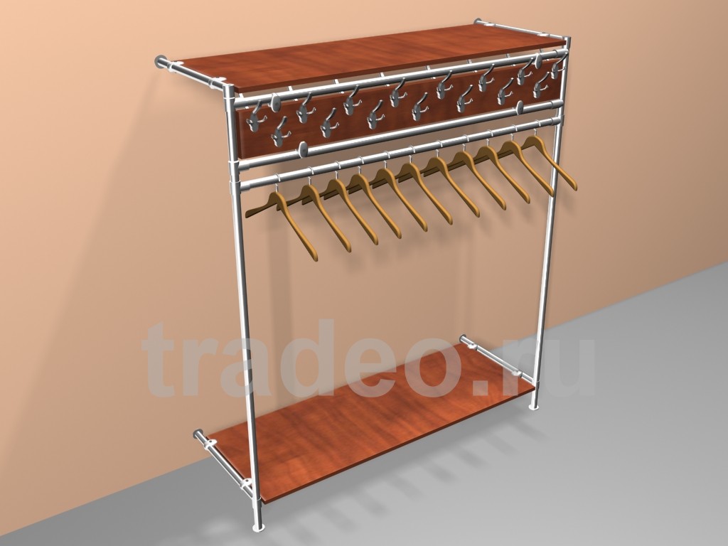 Материал: Металл-хром, Панель односторонняя на 9 крючков, полка ЛДСП для головных уборов и полка для обуви, дополнительная штанга на 15 плечиков